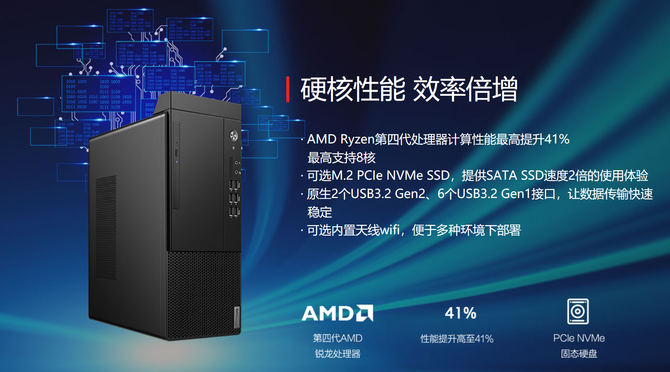 首先我们先来重点介绍CPU部分,对于AMD锐龙4000G系列台式处理器,相信对CPU市场有所了解的朋友都不陌生,这一代锐龙处理器不仅同样采用了最为先进的7nm制程工艺,而且还内置了AMD Radeon显卡,相比内置核显的处理器拥有更优秀的图形性能,企业用户不必购买独立显卡就能享受内容创作性能并且可以满足员工简单娱乐需求。联想启天M540商用台式机内核部分也很强大,可选最高16GB内存与512GB NVMe高速固态硬盘让整机保持高速运转。