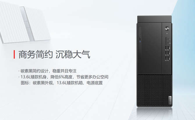 当然,出色自然要由内而外,联想启天M540商用台式机不仅性能出众,外观同样毫不逊色,碳素黑色的简约设计,尽显商务稳重, 13.6L矮款机身,降低6%高度,帮助企业有效地节省更多办公空间。