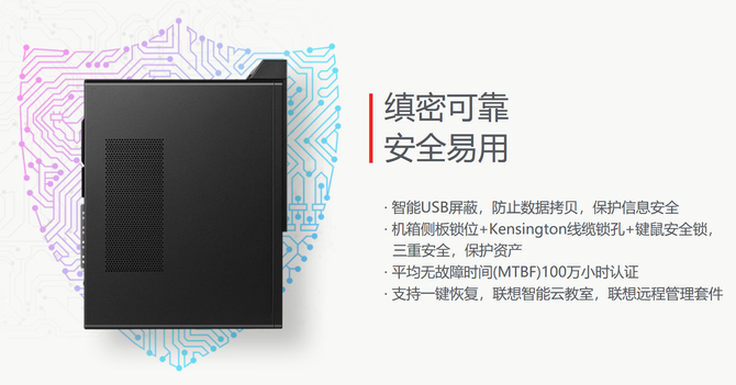 最后且最为重要的一点,联想启天M540商用台式机多项安全技术,直接有效地保护了企业数据和资产。智能的USB屏蔽可以防止数据拷贝,整机三重锁位有效保护资产,支持一键恢复方便办公使用。而多项认证可以帮助企业节省更多资源,减少消耗的同时践行绿色办公这一理念。