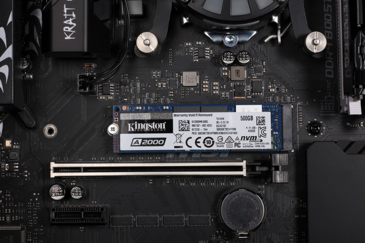 从上图可以看到,打开主流的PC机后,不禁发现硬盘仓的位置空空如也,而在主板M.2 PCIe×4 NVMe接口上紧贴着主板插着的,便是金士顿A2000 M.2 NVMe固态硬盘。