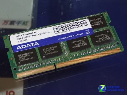 威刚单条8GB DDR3-1333笔记本内存批量上市中关村卖场,和入门级的威刚紫色PCB板V-DATA内存不同的是,这款内存属于高端A-DATA系列,采用绿色PCB板。