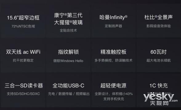 外观上,小米笔记本Pro采用全金属强化机身+镁合金骨架+全尺寸1.5mm高键程专业背光键盘(支持1C快充,35分钟冲50%电量),配备15.6英寸IPS窄边框屏幕(72% NTSC色域,81.5%的屏占比)+第三代康宁大猩猩玻璃覆盖。