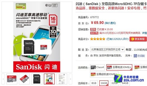 编辑点评:为手机、平板电脑扩容,首选16GB手机内存卡,在这些产品中,闪迪这款Class10存储卡是最受欢迎的。在京东的销售过程中倍受好评,有需求的朋友赶紧出手。