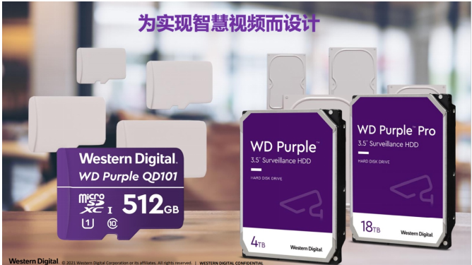 当然,业内主流的存储厂商敏锐地洞察到了这一趋势,像西部数据这几年来一直在围绕着监控存储推出创新性的存储解决方案。比如针对前端摄像头的WD Purple microSD存储卡系列,以及不断从容量、可靠性、耐久性、读写速度以及支持AI监控应用方面推进WD Purple HDD系列的性能优化。其倡导从终端到云端的全流程存储解决方案可以说高度契合智慧视频监控产业的发展需求。