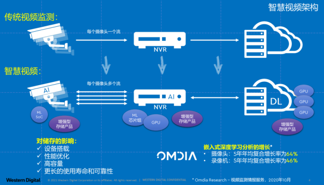 新兴的智慧视频系统架构能够实现获取、存储和分析大量的视频数据,并通过复杂的深度学习来执行视频分析,而这些变化都带来了更高的工作负载与存储需求。换言之,用户需要更高效、更智能、更可靠的存储解决方案来满足日益增长的存储需求。