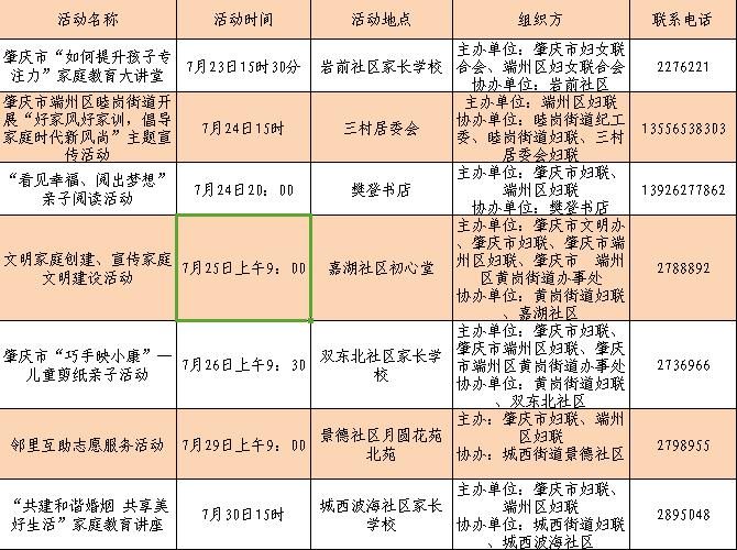 7月23日至30日,端州区将举办多场不同主题的妇儿家庭服务活动。活动包含家庭教育大讲堂、好家风好家训宣传、亲子共阅读、亲子手工乐等,感兴趣的你记得参加啦。